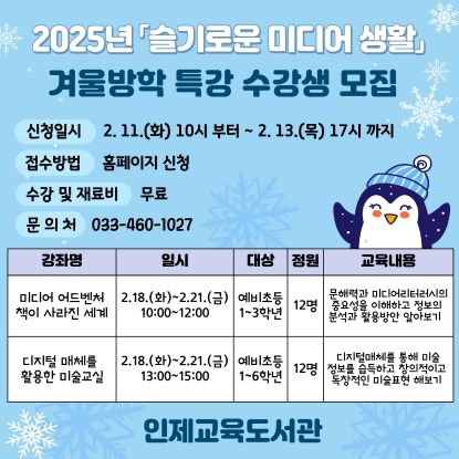 (아름다운교육신문) 인제교육도서관은 겨울방학을 맞아 초등학생 대상으로 미디어 활용 역량을 강화하고자 겨울방학 특강을 운영한다.