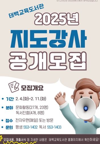 (아름다운교육신문) 태백교육도서관은 지역사회의 역량 있는 인적 자원을 발굴하기 위해 2월 4일부터 2월 11일까지 2025년 문화활동 프로그램 23명과 독서 프로그램 8명, 총 31명의 강사를 공개 모집한다.