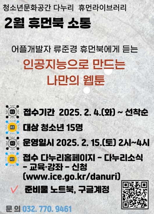 ‘휴먼북 소통’ 프로그램은 2월 15일 오후 2시부터 4시까지 다누리 누리마루에서 진행되며 앱 개발자 류준경 씨와 청소년들이 함께 인공지능을 활용한 웹툰을 만들어보는 ‘인공지능으로 만드는 나만의 웹툰’ 강좌가 예정되어 있다.