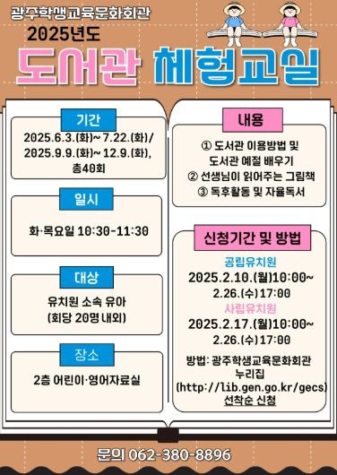광주학생교육문화회관 정은남 관장은 “이번 프로그램을 통해 유아들이 자연스럽게 책과 도서관을 접하고, 영어에 대한 흥미와 자신감을 갖게 되길 바란다”며 “앞으로도 지역사회와 연계한 독서 문화 풍토가 조성되도록 최선을 다하겠다”고 말했다.