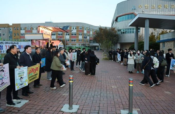 (아름다운교육신문) 전남 무안군은 13일 2026학년도 대학수학능력시험을 맞아 무안고등학교 등 관내 수능 고사장 앞에서 ‘길거리 수능응원’을 진행했다.
