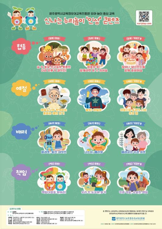(아름다운교육신문) 광주시교육청유아교육진흥원이 오는 30일 유치원·어린이집의 교육활동을 지원하기 위해 자체 개발한 ‘2025년 유아·놀이중심 교육 콘텐츠’를 배포했다.