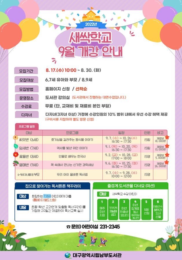 대구남부도서관(관장 배근영)은 8월 17일(수) 10시부터 독서습관 형성기에 있는 6~9세 어린이를 대상으로 책 읽는 습관과 자기주도 학습능력을 길러주고자 새싹학교 가을학기 참가자를 도서관 홈페이지를 통해 선착순으로 모집한다.