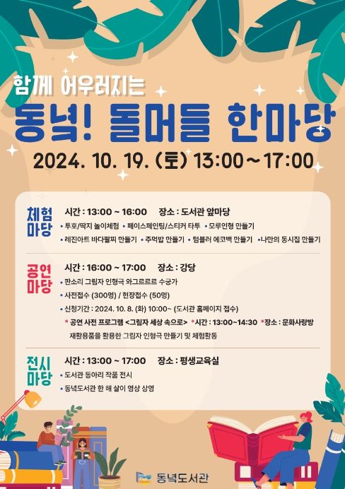 체험마당은 도서관 앞마당에서는 바다 팔찌, 모루인형 열쇠고리, 나만의 동시집, 보온병 친환경가방, 주먹밥 만들기와 페이스 페인팅/스티커 타투, 투호/딱지 전통놀이 체험이 운영되며 참여 방법은 체험별로 현장 참여하면 된다.