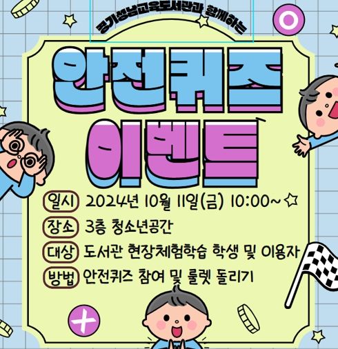 도서관 3층에 마련된 청소년 공간에서 진행된 이날 행사에는 희망대초등학교 6학년 학생들이 ▲교통안전 퀴즈 풀어보기 ▲생활 속 안전, 이건 알고 가자! ▲설문 참여 ▲돌림판(룰렛) 돌리고 상품 받기 등에 참여한다.