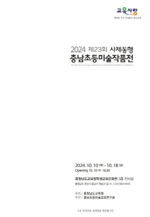 (아름다운교육신문) 충남교육청은 10월 10일부터 18일까지 충남교육청학생교육문화원에서 ‘2024 제23회 사제동행 충남초등미술작품전’을 개최한다고 밝혔다.