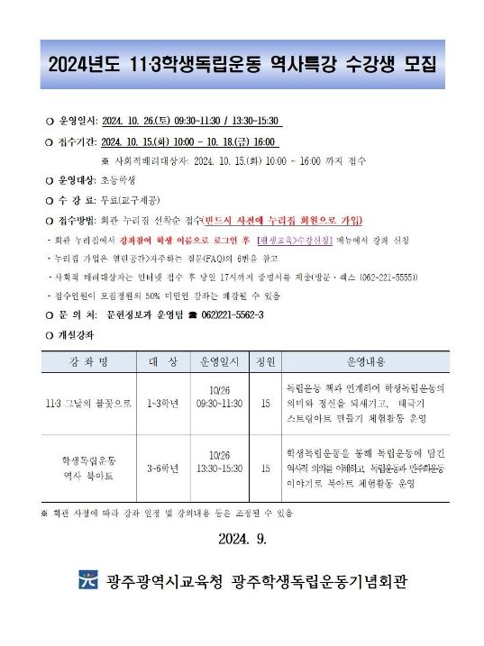 광주학생독립운동기념회관 정운용 관장은 “회관의 특성을 살려 역사와 체험활동을 연계한 특강을 준비했다”며 “올바른 역사인식 제고 및 역사에 관한 관심과 흥미를 유발할 수 있도록 다양한 프로그램을 추진하겠다”고 말했다.