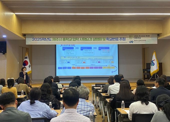 (아름다운교육신문) 제주시교육지원청은 8일 제주시 학교군(동지역) 초등학교 교감 선생님 및 학부모 대표를 대상으로‘2025학년도 제주시중학교 입학 시행 요강 설명회 및 학교 번호 추첨’을 실시했다.