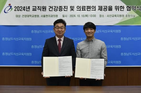 이날 협약식은 서산교육지원청 성기동 교육장 이하 관계자들과 김천수(건양대학교병원 헬스케어센터 부센터장), 김현성(서울현치과의원 대표원장)이 참석했으며, 이번 협약을 통해 서산교육지원청 소속 교직원과 가족의 건강증진은 물론 의료 편의 제공 및 할인 혜택으로 교직원 복지 향상에 기여하고자 체결됐다.