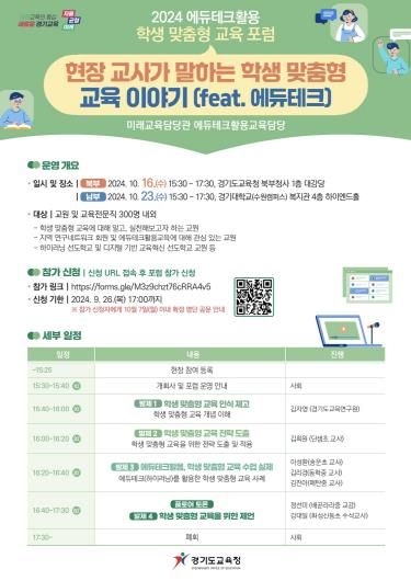 도교육청 김태석 미래교육담당관은 “학습자 개개인의 요구에 부응하고 교육의 질을 높이기 위해 에듀테크활용 맞춤형 교육의 실질적 방안을 논의하는 자리”라며 “디지털 대전환 시대에 맞춤형 교육의 방향과 교육 현장에서 디지털 기술의 효과적 적용 방안을 마련하겠다”고 말했다.