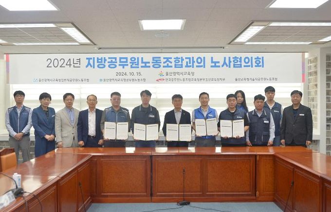 울산교육청은 천창수 교육감을 비롯해 지방공무원노동조합연대 관계자들이 참여한 가운데 15일 시교육청 공감회의실에서 ‘2024년 노사협의회 체결식’을 열었다.