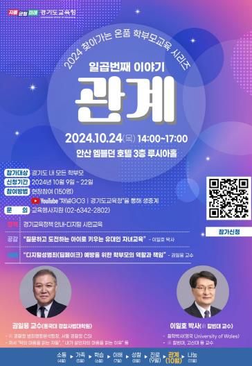 이번 학부모교육은 ‘관계’를 주제로 ▲정책의 시간 ▲공감의 시간 ▲이해의 시간으로 구성한다. 안산시(엠블던 호텔)에서 진행할 예정이며 현장 참여 가능 인원은 150명 내외다.