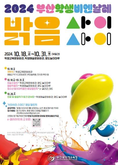 부산교육청은 ‘밝음 사이사이’를 주제로 ▲미술수업전 ▲협업작품전 ▲청소년 동시대 작품전 ▲진로 및 협업작가 토크콘서트 등 다채로운 프로그램으로 부산학생비엔날레를 운영한다.