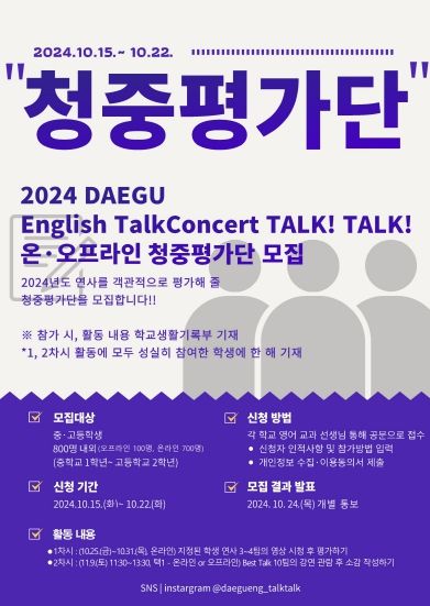 (아름다운교육신문) 대구교육연수원 산하 대구글로벌교육센터는 오는 11월 9일에 개최되는 ‘2024. 대구 영어 토크콘서트 톡!톡!’본선 무대에 오를 학생 연사들을 평가하기 위한 학생 청중 평가단 8백여 명을 모집한다.