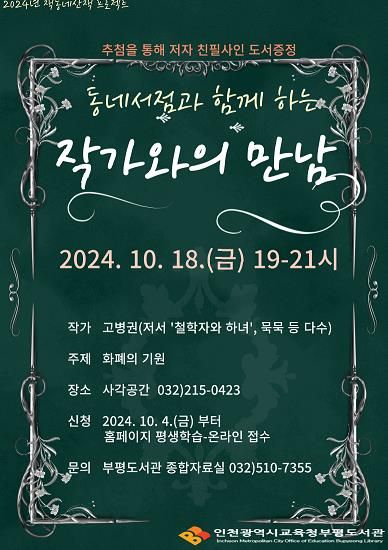 해당 프로그램은 부평도서관 누리집에서 신청 가능하고, 추첨을 통해 작가의 친필 사인 도서를 증정한다.