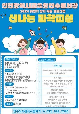 참가 신청은 10월 21일 월요일 오전 10시부터 연수도서관 누리집에서 가능하며, 자세한 내용은 연수도서관 독서문화과로 문의하면 된다.