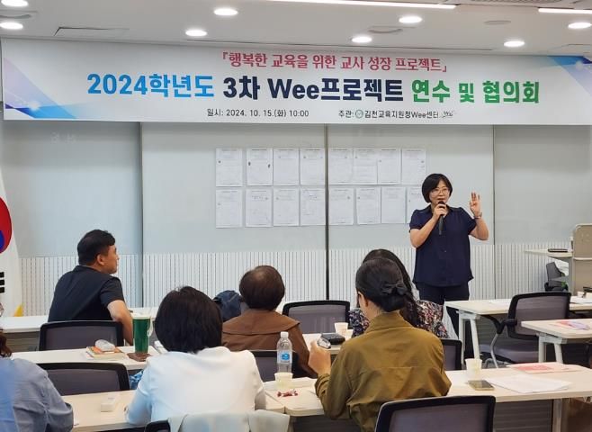 (아름다운교육신문) 경상북도김천교육지원청 Wee센터는 10월 15일 10시 관내 초, 중, 고등학교 Wee클래스 전문상담(교)사 및 업무 담당자 42명을 대상으로 김천교육지원청 Wee센터 3층 대회의실에서 2024학년도 3차 Wee프로젝트 연수 및 협의회를 실시했다.