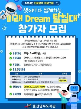 (아름다운교육신문) 울산남부도서관은 오는 11월 16일부터 30일까지 변화하는 과학기술과 인공지능을 실생활에 활용하게 하고자 ‘챗지피티(Chat GPT)와 함께하는 미래 꿈 탐험대’ 프로그램을 운영한다.
