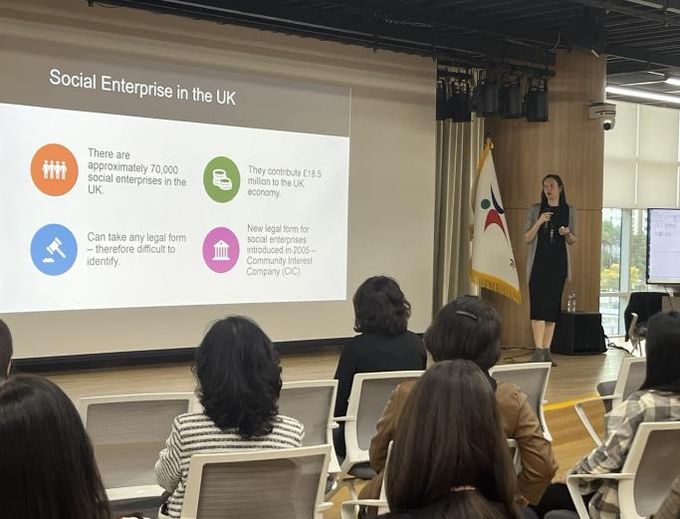 이어 글로벌 교육 관점에서 ▲사회적기업의 정의 및 특징 ▲사회적기업 소개 ▲영국 및 한국의 대표적 사회적기업 관련 정보 등을 중심으로 강의를 진행했다.