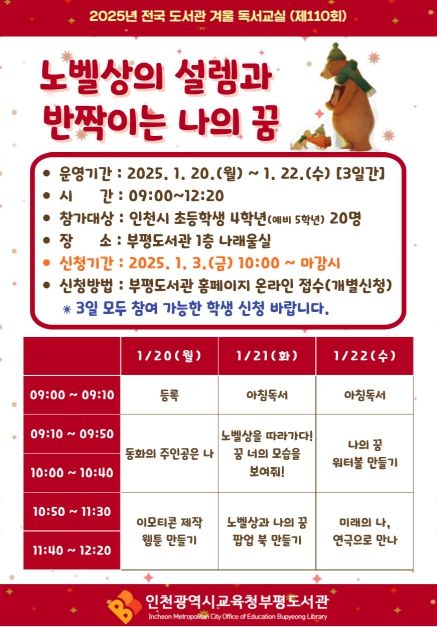 (아름다운교육신문) 인천광역시교육청부평도서관은 초등학교 4학년 20명을 대상으로 1월 20일부터 22일까지 ‘2025년 겨울 독서 교실’을 운영한다.