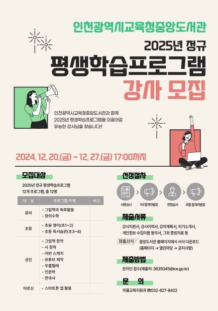 (아름다운교육신문) 인천광역시교육청중앙도서관(관장 정경애)은 지역 주민을 위한 ‘2025년 평생 학습프로그램’ 강사를 공개 모집한다.