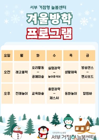 (아름다운교육신문) 인천서부교육지원청 서부 거점형 늘봄센터는 겨울방학을 맞아 오는 26일부터 늘봄학교 학생들을 대상으로 특강 프로그램을 운영한다.