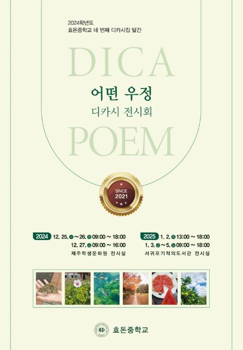 오는 25일부터 27일까지 제주학생문화원 전시실과 2025년 1월 2일부터 5일까지 서귀포 기적의 도서관에서 전시되며 효돈중학교 교육가족과 지역사회 참여자들에게 디카시 작품을 감상할 수 있는 좋은 기회를 제공한다.