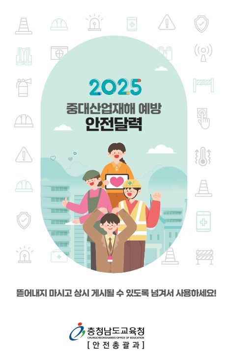 (아름다운교육신문) 충남교육청은 근로자들의 안전의식 강화와 중대산업재해 예방을 위해 2025년 중대산업재해 예방 안전달력을 제작해 도내 모든 학교와 기관에 배부한다고 밝혔다.