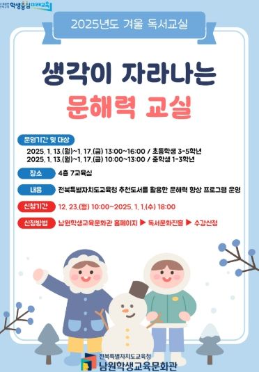 (아름다운교육신문) 전북특별자치도교육청남원학생교육문화관은 지역 학생들의 독서활동 지원 및 문해력 향상을 위해 ‘생각이 자라나는 문해력 교실’을 주제로 2025년도 1월 13일부터 1월 22일까지 2025년도 겨울 독서교실을 운영한다.