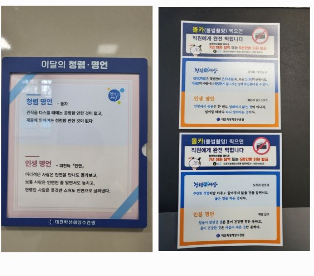 (아름다운교육신문) 대전학생해양수련원은 생활 속 청렴문화 정착을 위하여 수련원 내 화장실에 이달의 청렴·명언 홍보판 및 스티커를 제작하여 부착했다고 밝혔다.