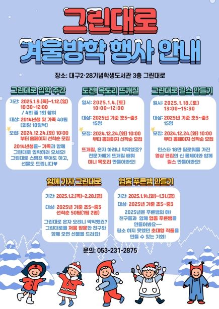 (아름다운교육신문) 대구2·28기념학생도서관은 트윈세대(초등 5 부터 6학년 및 중학생) 전용공간인 그린대로에서 1월 4일부터 2월 28일까지 다섯 가지 겨울방학 행사를 운영한다고 밝혔다.