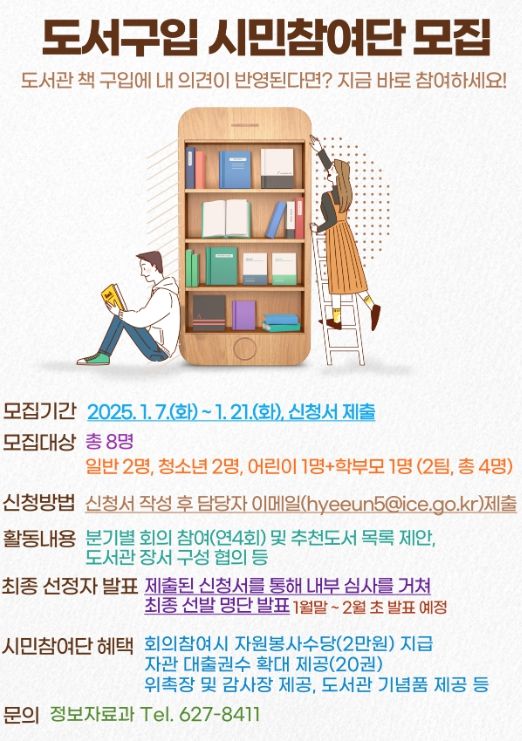 (아름다운교육신문) 인천광역시교육청중앙도서관은 지역 주민이 직접 도서관 장서구성에 참여하는‘도서 구입 시민참여단’회원을 모집한다.
