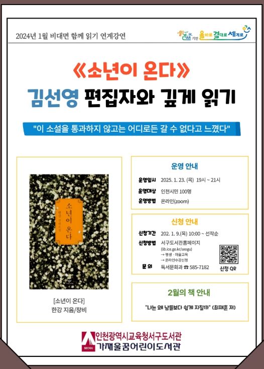 (아름다운교육신문) 인천광역시교육청서구도서관은 1월 23일 오후 7시, 1월 ‘비대면 함께 읽기’ 연계 프로그램으로 김선영 편집자를 초청하여 ‘소년의 온다’깊게 읽기 강연을 비대면(ZOOM)으로 운영한다.