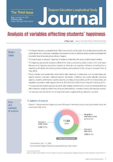 대전교육정책연구소는 자체 대전교육종단연구 온라인시스템을 통해 관내 모든 초·중·고 학생(초5, 중2, 고2), 해당 학년의 학부모 및 지도교사, 학교장, 행정직원을 대상으로 제1차 종단데이터를 수집․구축했다. 2024년 대전교육종단연구저널 3, 4호는 제1차 대전교육종단연구 데이터를 주제에 맞게 통계 분석한 연구 결과물로 대전교육종단연구 연구책임자인 이지혜 대전교육정책연구소 연구위원이 집필했다.