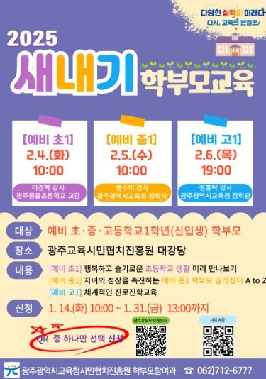 (아름다운교육신문) 광주교육시민협치진흥원은 오는 2월 4~6일 원내 대강당에서 초·중·고등학교 신입생 자녀를 둔 학부모를 대상으로 ‘2025 학교급별 새내기 학부모교육’을 운영한다.