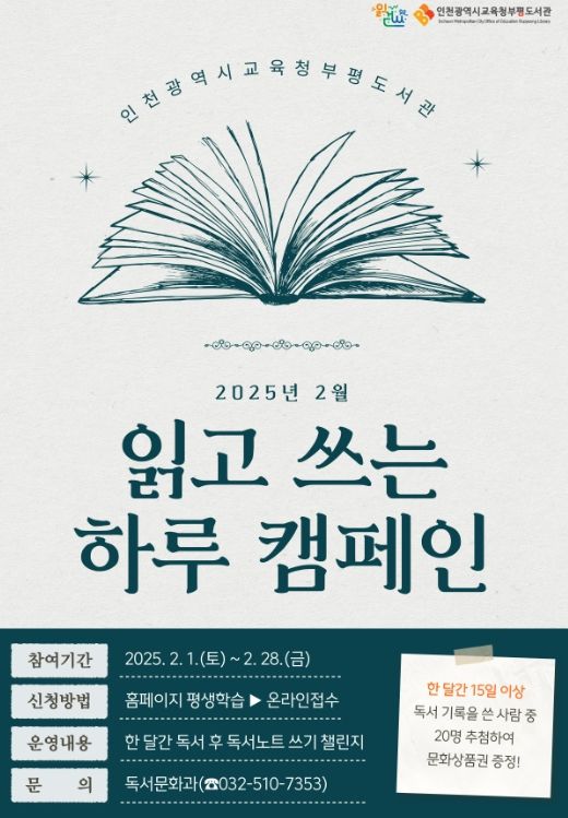 (아름다운교육신문) 인천광역시교육청부평도서관은 읽걷쓰 문화 확산을 위해 2월 한 달간 ‘읽고 쓰는 하루 캠페인’ 참여자를 모집한다.