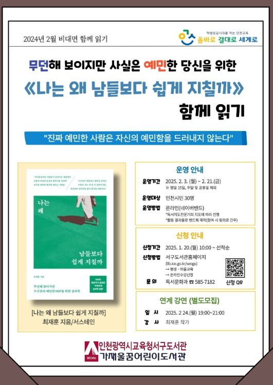 (아름다운교육신문) 인천광역시교육청서구도서관은 2월 3일부터 21일까지 인천시민을 대상으로 2월‘비대면 함께 읽기’ 프로그램을 운영한다.