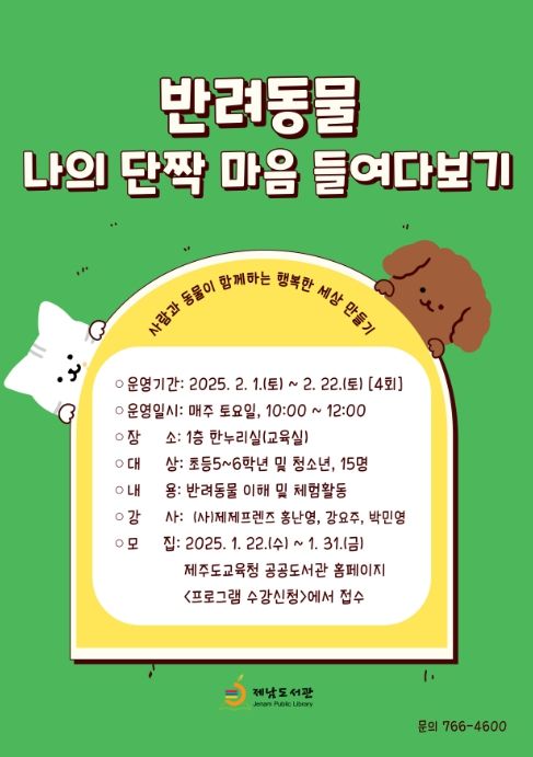 (아름다운교육신문) 제주도교육청 제남도서관은 동물 사랑과 존중을 통한 올바른 인성 함양 및 생명존중 인식 제고를 위해 초등 5~6학년 및 청소년 15명을 대상으로 ‘2025년 반려동물, 나의 단짝 마음 들여다보기’를 운영한다.