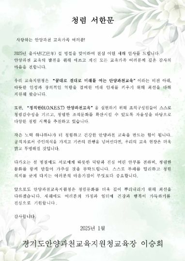 이번 서한문에는 교육 발전을 위해 헌신해 온 안양과천 교육가족에 대한 감사 인사와 함께, 모두가 함께 청렴 문화를 만들어가자는 당부의 메시지가 담겼다.
