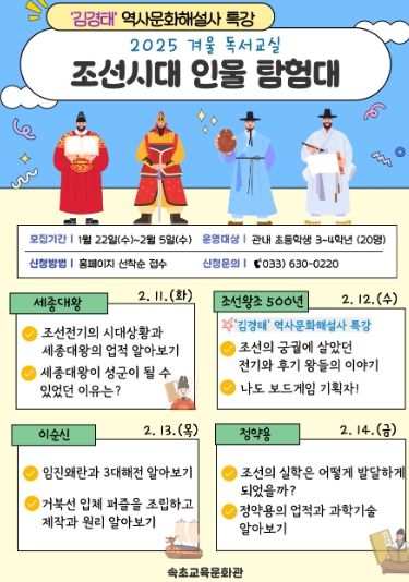 (아름다운교육신문) 속초교육문화관은 겨울 방학을 맞이하여 관내 초등학교 3~4학년 20명을 대상으로 ‘조선시대 인물 탐험대’를 주제로 한 겨울 독서교실을 운영한다.
