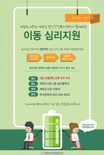 이동 심리지원은 23일 오후 2시부터 4시까지 계양도서관 1층‘글오름 학교’에서 진행되며, 사전 접수 없이 누구나 참여할 수 있다.