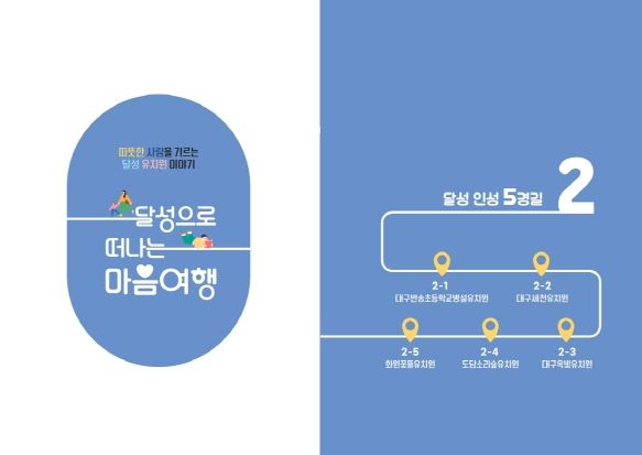 장학자료는 총 3부로 구성됐다. ▲1부 ‘마음여행 준비하기’에서는 대구인성교육 및 유아인성교육의 방향을 제시하고, ▲2부‘달성 인성 5경길’에서는 공립 단설·병설, 사립유치원의 인성교육 실천 사례를 소개한다. ▲3부 ‘다시 갈 마음여행’에서는 인성교육에 대한 도움말과 따뜻한 사람을 기르는 인성 명소로 자리매김하고 있는 달성 관내 전체 유치원을 담은 지도가 펼쳐진다.