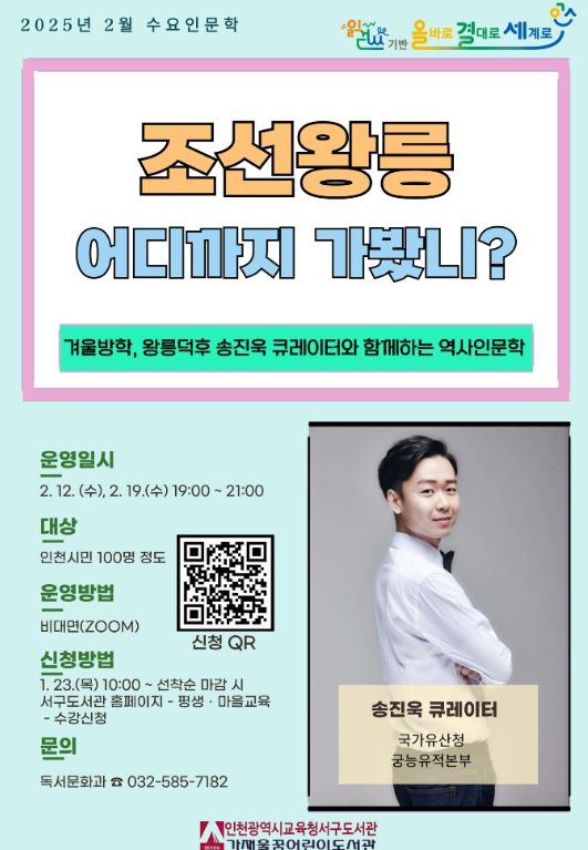 (아름다운교육신문) 인천광역시교육청서구도서관은 2월 12일과 19일 오후 7시 수요 인문학 프로그램으로, 송진욱 큐레이터를 초청하여 '조선왕릉, 어디까지 가봤니?' 강연을 온라인으로 진행한다.
