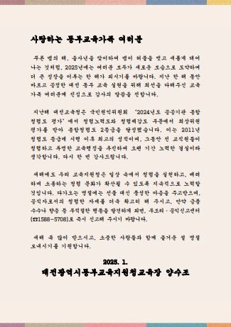 대전동부교육지원청 양수조 교육장은 “다가오는 설 명절에는 선물 대신 풍성한 마음을 주고받으며, 소중한 사람들과 함께 즐거운 명절을 보내기를 바란다.”고 전했다.