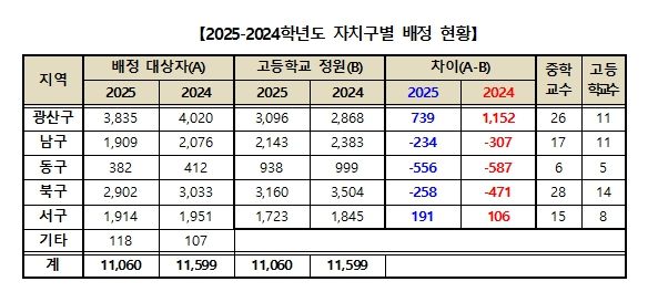 올해는 학교 유형의 변경 및 과밀학급 완화를 위한 설명회 등을 통해 평준화 일반고 신입생 지원의 상황이 변화됐고, 이에 따라 갈수록 심화되어 왔던 자치구별 밀려서 배정되던 현상도 다소 완화됐다. 또한, 자치구별 고등학교 분포의 불균형을 해소하기 위한 노력으로 2027년 개교 예정인 광산고(가칭)를 추진하고 있어 이러한 현상은 점진적으로 완화될 것으로 예상한다.