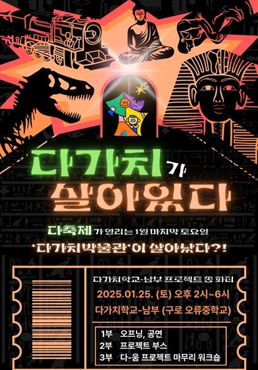 (아름다운교육신문) 서울특별시교육청은 1월 25일 구로구 오류중학교에 위치한 ‘다가치학교-남부’에서 청소년 주도 프로젝트 활동 공유를 위한 ‘다축제’를 개최한다.