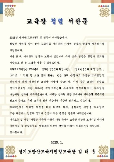 (아름다운교육신문) 경기도안산교육지원청은 2025년 설 명절을 맞아 청렴실천 의지를 담은 교육장의 청렴서한문을 교육지원청 각 부서와 안산 관내 각급 학교에 발송했다고 23일 밝혔다.