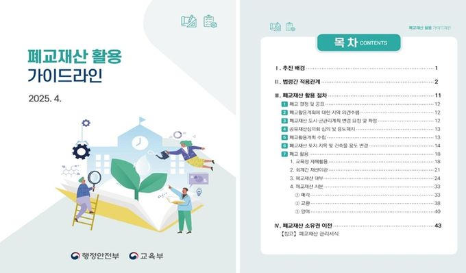 이번에 마련한 가이드라인은 최근 학생 수 감소로 전국적으로 폐교가 증가하는 상황에서 지자체가 폐교를 효율적으로 활용할 수 있도록 폐교 공표부터 대부·매각까지 전반적인 행정절차와 적용 법규를 알기 쉽게 설명한 안내서이다.