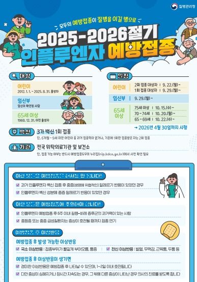 예방접종은 ▲생후 6개월~13세 어린이(2012.1.1.~2025.8.31. 출생), ▲임신부, ▲65세 이상 어르신(1960.12.31. 이전 출생)을 대상으로 하며, 특정 기간 쏠림 현상을 막기 위해 대상자와 연령대를 나누어 순차적으로 진행된다. 대상자는 주소지와 관계없이 지정 위탁의료기관에서 무료 접종이 가능하다.