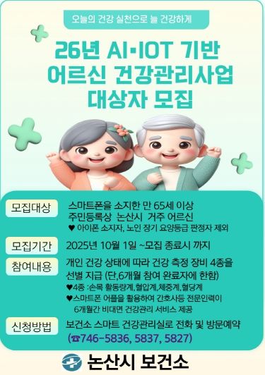 (아름다운교육신문) 논산시는 오는 10월 1일부터 선착순으로 2026년 AI-IoT(인공지능·사물인터넷) 기반 어르신 건강관리사업 참여자를 모집한다.